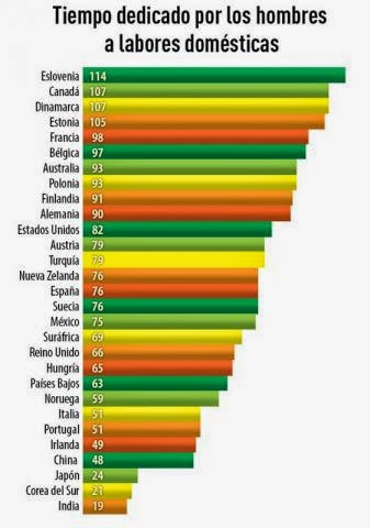 En los últimos 50 años, las horas que las mujeres dedican a las labores del hogar han descendido y ha aumentado el tiempo de los hombres destinado a estas rutinas pero, ¿en qué países los hombres dedican a estos trabajos?. Este informe señala a Eslovenia como el país en el que los hombres trabajan más en casa, mientras que en el lado opuesto se sitúan los indios y, dentro de la OCDE, los hombres de Turquía y Corea del Sur.