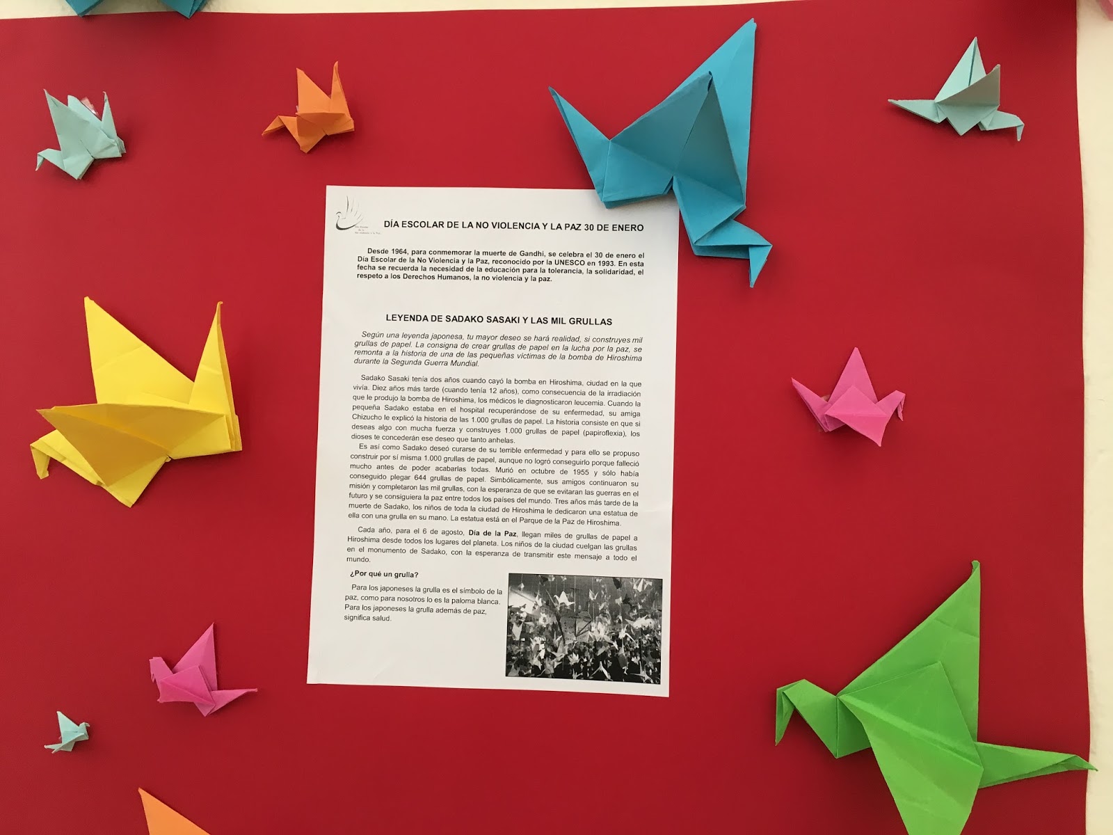 El alumnado de 1º de bachiller ha mostrado mucho interés por la Leyenda de las mil grullas y han intentado hacer el mayor número posible de grullas de origami. Aunque no hemos podido llegar a mil… El resultado ha sido un bonito mural del que están muy orgullosos.